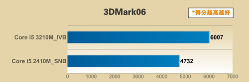 我们先来看看新的IVB处理器在DX9.0特性下的成绩提升比例。新IVB双核处理器i5 3210M超越上代SNB平台的i5 2410M处理器27%,达到了6007分,并且此分数已经超越了目前的入门级显卡。