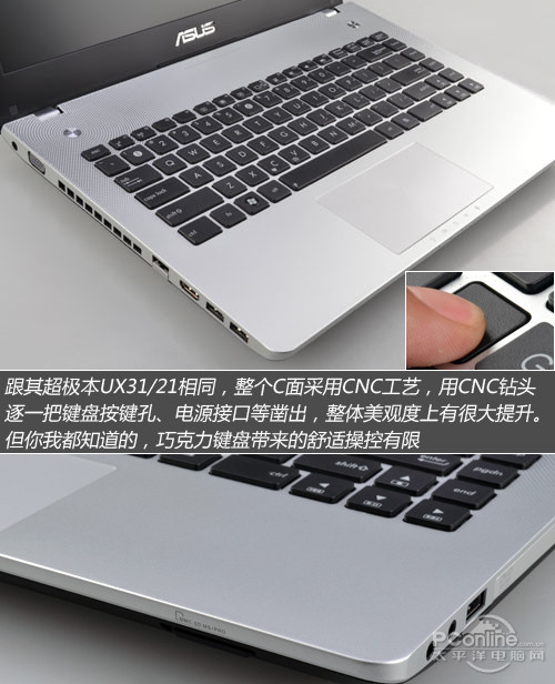 华硕N46VM掌托采用与Macbook Pro相同的Uni-Body工艺打造,质感强烈,同时对比鲜明的黑色键盘提升了C面的简约之气。此外,华硕N46VM全尺寸巧克力键盘设计,按键键程适中,回弹性不错,不过由于掌托末端并没有采用圆角设计,所以在长时间打字之后会感到手腕部位有些不太舒服。