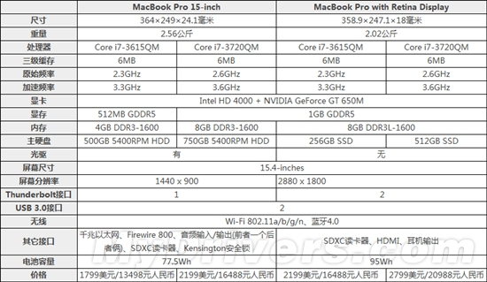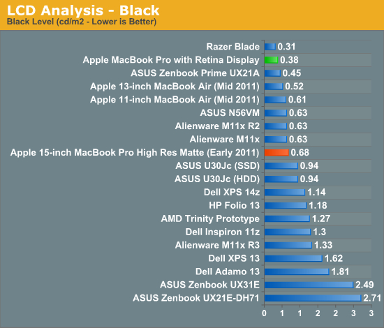 一如既往,苹果对付反射和强光的方法是使用拥有很高黑度的极亮的面板。视网膜版MBP是苹果第一次在MBP里使用IPS面板,可视角度和黑度大大改善,特别是后者仅次于Razer的首款游戏笔记本Razer Blade,不过白度还是比较普通。