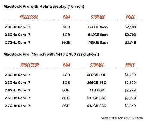 和旧款MacBook Pro的最低价格1799美元相比,Retina版MacBook Pro从2199美元起跳,并且最高配版本价格高达3749美元。相对应的,如果不管屏幕,将硬盘换成1T的机械硬盘的话,2.6GHz+8GB版本的旧 版MacBook Pro和2.6GHz+8GB版本的新版相比可以省500美元,当然你也可以认为这500美元买的就是屏幕。