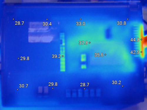 接下来我们再看看华硕Pro4JS背部散热的情况,从上图的结果来看,两者不分伯仲,温度高的地方主要集中在机身背部的右侧,散热窗的温度最高达到了45度。综上所述,华硕Pro4JS的散热有待改进。