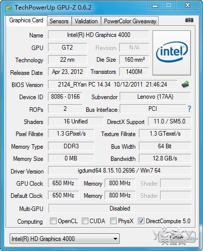 Ivybridge内置的Intel HD Graphics 4000核芯显卡同样采用了22nm制程技术制造,相比上一代,性能有了更大的提升,而且能耗更低。通过3DMark Vantage测试,得到了E12638分的成绩,其中GPU得分13491,表现很不错。