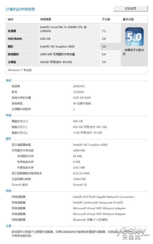 通过以上测试,我们了解了这款笔记本各部件的性能,那接下来我们就来看看整体表现如何。Windows 7系统自测,成绩为5.0分,处理器7.2的得分最高,由此也可以看出整体性能均衡,没有明显瓶颈。