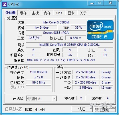 英特尔酷睿 i5-3360M 处理器,双核心四线程,默认主频为 2.8GHz,可睿频至 3.5GHz,TDP功耗为 35W,3M 三级缓存。
