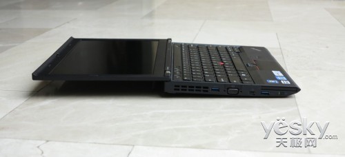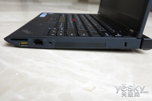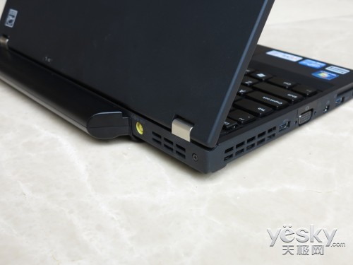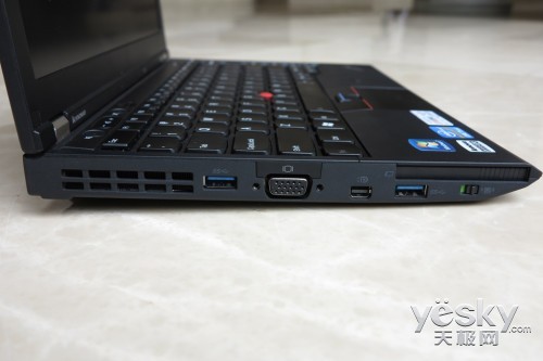 考虑到中国人普遍右手使鼠标的习惯,笔记本在左侧接口设计上非常用心,X230将散热风口设计在了这一侧的末端,往前依次是USB3.0接口、VGA端口、DisplayPort端口。最靠近前端的地方,上边是一个ExpressCard 插槽,下方是USB3.0接口和无线网卡物理开关。升级USB3.0,也是此次的一大亮点,数据传输速率有了更大的提升。