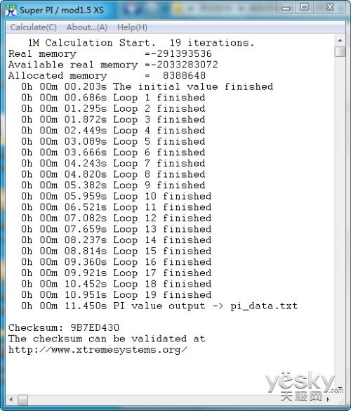 Super PI是一款通过运算圆周率π的N位小数来展现处理器运算速率的软件。测试中,我们通过运算100万位π的值,并重复20次的方式,结果显示,总用时11.450秒,平均每次运算用时不足2秒。进一步证实处理器性能的强力。