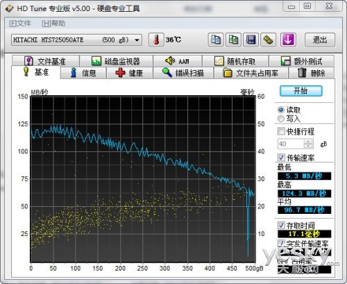500GB大容量硬盘,通过HD Tune 测试,结果显示最高传输速率达到了124MB/秒,平均传输速率也达到96.7MB/秒。表现还是比较出色的。