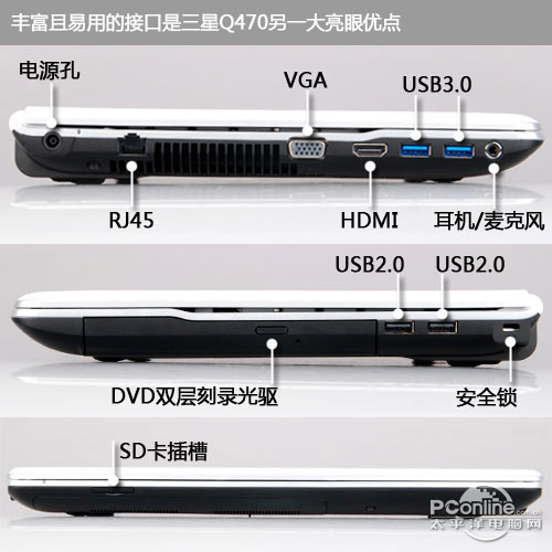 接口方面,三星Q470-BT03配备了4个USB接口,其中还包括了两个USB 3.0接口;此外,如HDMI、VGA、RJ45等常见接口也一应俱全,轻松满足日常外接投影仪、显示器等多样化使用需求。