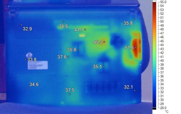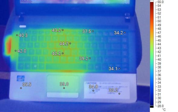 散热方面,E1-471G的出风口,风力强劲,底部也设有散热口。我们用FurMark运行30分钟以上,用热感仪进行拍摄,得出结果。事实证明,E1-471G的散热能力还是不错的,强力的风扇给予它不小的帮助。