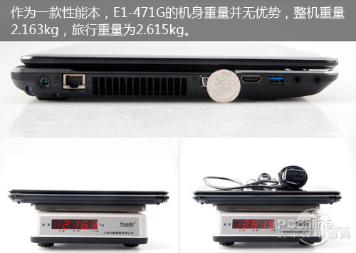 作为一款性能本,E1-471G的机身重量并无优势,整机重量2.163kg,旅行重量为2.615kg。