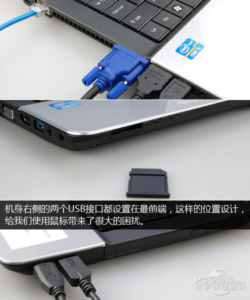 E1-471G作为一款性能本,接口非常丰富。机身左侧为电源接口,以太网口,VGA接口,HDMI接口,USB3.0接口和音频、话筒插口。右侧为光驱和两个USB2.9接口。机身前部左侧还有多功能读卡器。要特别注意的是,机身右侧的两个USB接口都设置在最前端,这样的位置设计,给我们使用鼠标带来了很大的困扰,为什么不能设计在机器后部,难道要我们将鼠标绕一圈插在左侧仅有的USB3.0接口上?