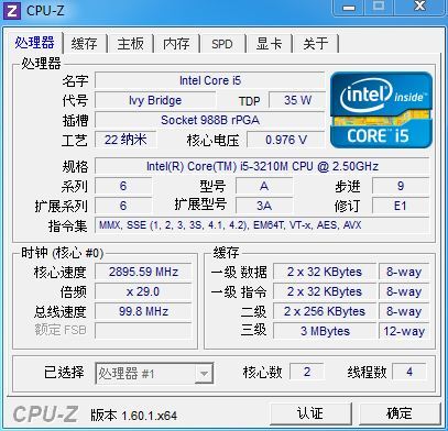 处理器 Intel Core i5-3210M 主频2.50GHz