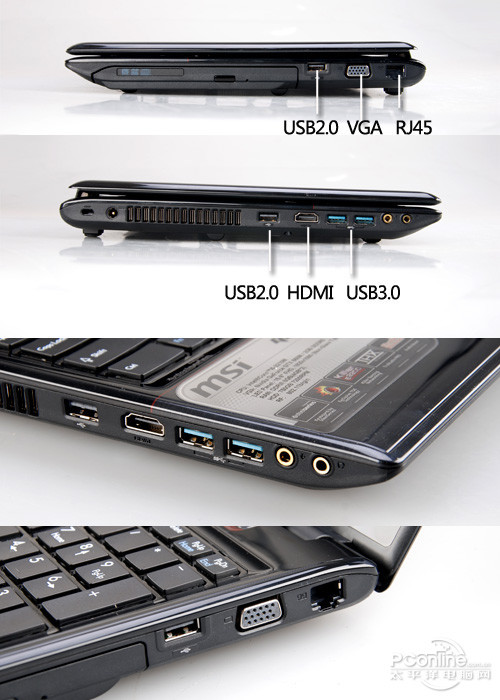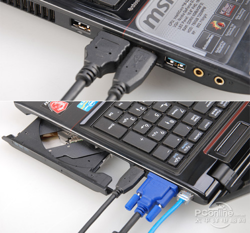 微星GE60的接口非常齐全,机身共有2个USB3.0,2个USB2.0、VGA、HDMI、RJ45等常用接口,实用性很不错,还标配了一个DVD刻录机。