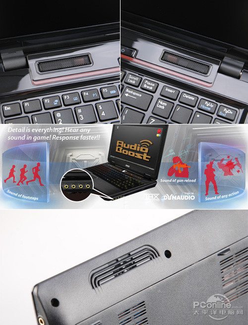 微星GE60采用采用了音响大厂Dynaudio的音箱设计理念,音箱的位置和使用者距离都有颇多的理论,加上内建的顶级喇叭能够展现较高的声音质量。另外它还有Audio boost音响解决方案,内建耳机专用功率放大芯片(AMP)、与采用昂贵镀金接头。在增加抗氧化、传输效率与防噪的强度之后能够实现更为清晰准确的声音定位,在游戏中颇为实用。而且你完全不用担心它的音量,因为它一共有四个发声单元。