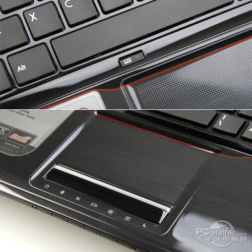 微星GE60触控板表面是非常细密的颗粒,摩擦力不错。紧邻左右按键的是七个系统运行指示灯,在运行时能很容易的了解系统状态。另外触控板的上方有一个解锁键,可以一键开启/关闭触控板。
