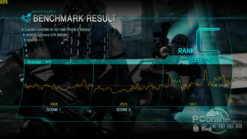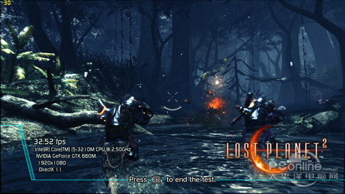 《失落星球2》是一款非常能检验硬件性能的游戏,GTX660M在这款游戏中表现就有些吃力了,最终结果接近30FPS,在视觉效果上稍微有些卡顿,如果想要畅玩还得降低分辨率才行。