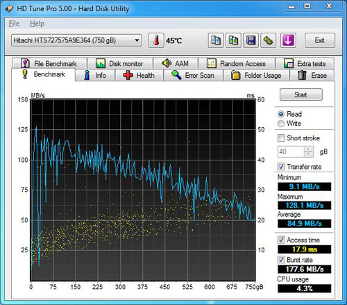 微星GE60标配了一块750GB的机械硬盘,因为是7200转速的,所以读写速度要比常见的5400转速笔记本硬盘稍快一些,最大读取速度能到128MB/s。如果对它的速度不满意不妨考虑增添一块M-sata SSD固态硬盘。