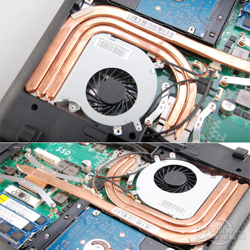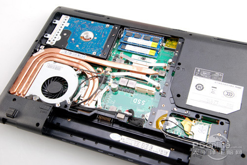 微星GE60采用了三条散热导管,分别连接到处理器和独立显卡模块上,出风口是铝制的散热片,总体来看用料中规中矩,相比Y580的大块头散热模块还有有一定差距的,具体还是要看烤机的效果。