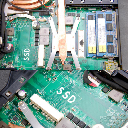 除了散热的设计以外,还能看到内部的扩展口,比较遗憾的是内存插槽插满了两条4G内存,目前来说8G的内存已经够用了。另外它还预留了一个M-SATA的扩充口,是给SSD固态硬盘准备的。