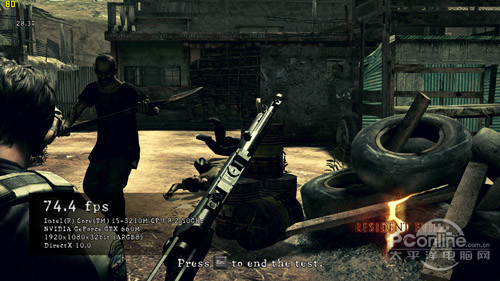 《生化危机》系列是非常受欢迎的射击类游戏,其在光影效果上也是DX10游戏中的代表之作。我们依旧保持在1920x1080的分辨率下,测试结果依然是非常惊人的76.6FPS。看起来必须要上一些非常吃硬件的游戏了。