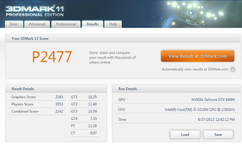 NVIDIA Geforce GTX660M性能很强的移动平台独显,它具备了384个流处理器,16个ROPs单元,配备了2GB GDDR5显存,128Bit位宽。在基础的3Dmark测试中,它已经突破了15000分大关。而基于DX11的3Dmark 11则是超过了2400分。当然跑分只是一个方面随后我们会再用游戏验证一次。