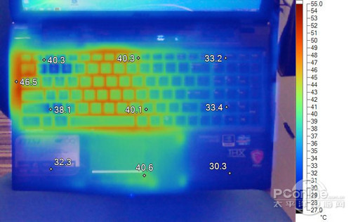 微星GE60 的WASD键盘区温度刚刚超过40°C,在手掌经常触摸的区域,机身温度都并不是很高,机身最高温度位置是在出风口的位置,这个位置的温度对使用体验没有太大的影响,总体来说散热效果还是可以接受的。