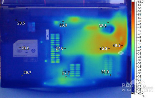 散热测试:furmark会将整机的两大发热部件CPU与显卡全运转起来,运行30分钟后温度会上到一个极限的高度,我们采用热感仪进行温度检测(温度跨幅27°C-55°C:低于温度下限会显示黑色;超过温度上限会显示白色)。