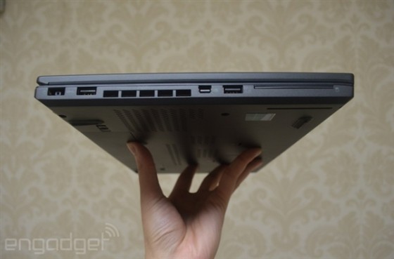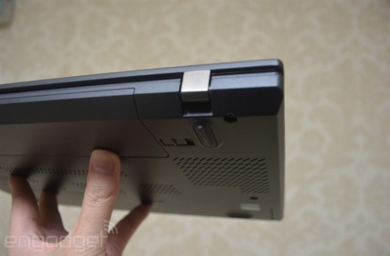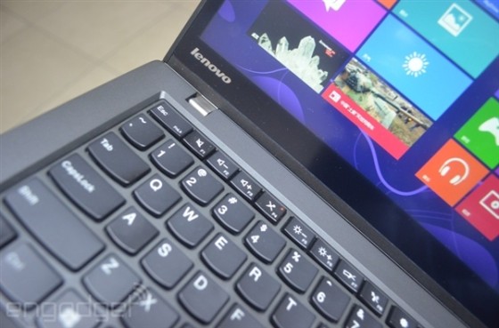 键盘右侧还集成了指纹识别器,主要针对商务人士使用,电源键则集成到了右上角。总体来说,和早先发布的ThinkPad S3基本一致。至于这种改变好不好,就见仁见智了。另外,屏幕铰链改为下沉式设计,这样打开180度的时候在桌面上就无法平放了,估计老用户很难接受。