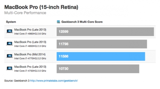 苹果昨天推出了5款新的视网膜版MacBook Pro,包括3款13寸和2款15寸产品,现在新款15寸低配版的性能跑分结果已经出现在Geekbench数据库。