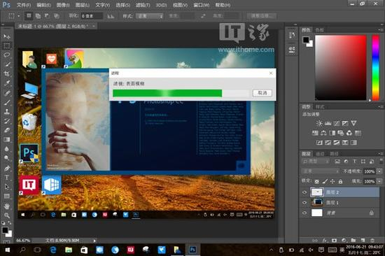 这款PS支持高分屏,因此测试用该版本更好一些。然而由于Photoshop属于办公软件中的庞然大物,它对电脑配置还是有更高要求的。在之前的测试中,Surface Pro 4能够轻松应付PS, 不卡顿,打开也快,约为1.3秒。但在本次对MateBook的测试中,打开Photoshop时间倒是不长,也就2秒左右,但加载大分辨率图片和处理图 片时间就明显过长。本次加载的是MateBook内置的壁纸,分辨率2K,加载需要2秒左右;测试局部进行图层模糊特效处理,过程会稍显缓慢,并且要等待 5至6秒的时间,可能会让用户感到不流畅。所以要想用Photoshop的话,MateBook多少会有些吃力。