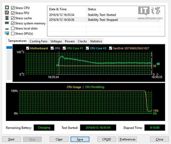 图片说明:使用AIDA64对MateBook压力测试(15分钟数据)