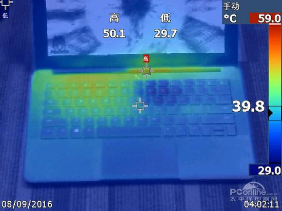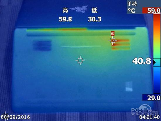 我们使用Furmark拷机软件对雷蛇灵刃潜行版进行测试,Furmark会将整机的两大发热部件CPU与显卡全运转起来,运行30分钟后温度会上到一 个极限的高度,为了让大家可以更加直观的看出其在运行时的散热情况,我们还使用了FLUKE红外热成像仪,分别观察各个位置的温度升温情况。(温度跨幅 29°C-59°C:低于温度下限会显示黑色;超过温度上限会显示白色)。