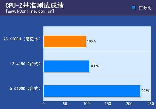 同样给大家一张百分比图,通过CPU-Z自带的测试我们可以比较直观的了解这款产品使用的CPU i5 6200U的性能,大体上来看就是和4代桌面级i3 4150的性能差不多(甚至还要弱些),跟6代桌面级i5 6600K比就是一个天一个地了。(整体给人感觉比较弱,不过超级本嘛!主打办公,这就够用了!况且频率太高性能太强对续航没好处。)