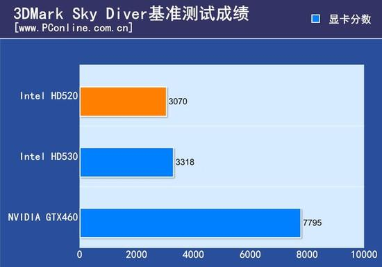 HD520在运行Sky Diver基准测试时的显卡分数为3070分,这大概是个什么水平呢?这么说吧,它比目前最新的桌面级六代酷睿i3/i5/i7自带的HD530性能还要差一些;和NVIDIA六年前(2010年)发布的GTX460独显还有着接近一倍多的差距,我这么说诸位心里有底了罢?