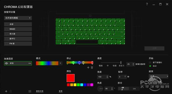 笔记本键盘背光作为一项兼具视觉冲击与实用性的功能,其也成为中高端笔记本产品必备项。打开Razer Synapse雷云,可以看到雷蛇灵刃潜行版提供了很多与设备相关的设置项。作为笔记本界灯厂的精心之作,雷蛇灵刃潜行版在键盘等效部分自然有着出色的表现。