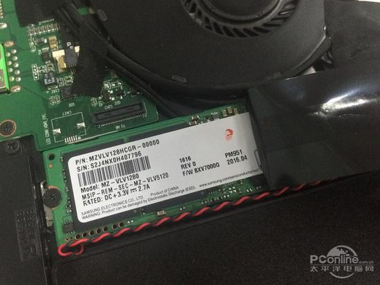 虽然超级本大多都没有什么扩展性可言,但我们还是不死心的拆开了雷蛇灵刃潜行版的D面;可以看到,由于是板载的内存,也没有额外的内存插槽,所以想加内存的朋友还是死了这条心吧!不过,这款产品M.2接口走的是PCIe 3.0x4通道且支持Nvme,换个容量大点的M.2 SSD还是不错滴!大家如果嫌硬盘容量太小的话可以自行更换成诸如三星SM951 512G等一类的M.2 SSD,毕竟128G实在是小。
