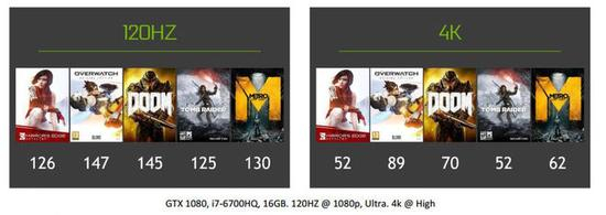 NVIDIA觉得只是塞进一块完整的桌面显卡完全不够,在首批加入GTX 10系列笔记本阵营的笔记本中,无一例外自带G-SYNC 120Hz刷新的显示器,按照官方给出的数据,无论是《镜之边缘:催化剂》、《守望先锋》、《DOOM》、《古墓丽影:崛起》还是《地铁:最后曙光》,在 笔记本采用GTX 1080、Intel Core i7-6700HQ、16GB RAM最高画质且1080p分辨率下,帧数都轻松突破120fps,而诸如《守望先锋》甚至可以逼近147fps,再加上帕斯卡上自带的Fast SYNC解决高速刷新时候的屏幕撕裂问题,新系列的笔记本完全能拥有不输台式机的性能。