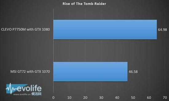 同样在《古墓丽影:崛起》DX12模式最高画质下,我们分别在MSI GT72和CLEVO P7750M上获得了46.58fps和64.98fps的成绩,3A级大作对于两款笔记本而言毫无压力。