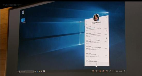 另外一个比较值得关注的改进是 Win10 自带的社交网络功能。你能够直接在任务栏上放上自己的常用联系人,并且可以通过这个入口直接发送文件和聊天(现场展示使用的是 Skype)。界面上语音和视频聊天的功能也有显示。