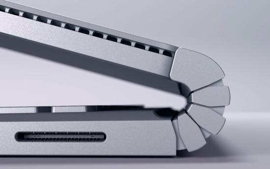 原先 Surface Book 的底座部分整体厚度基本一致,但在微软“催肥”之后,底座的侧视图变成了一个躺倒的梯形,越靠近转轴位置越高。同时,原先底座设置于转轴的出风口也被转移到了上方,整体散热条件大大加强。