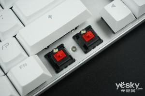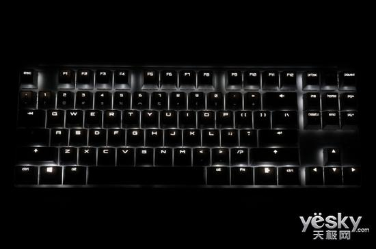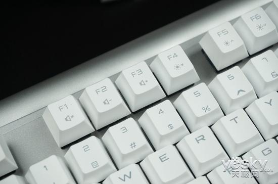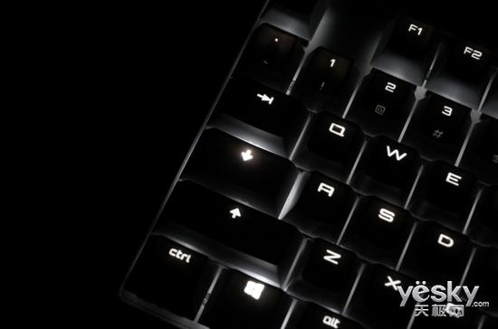 FN+F5/F6以及F7/F8均为背光控制,其中FN+F5/F6为背光明暗调节,每一档幅度为25%;FN+F7/F8这两个按键期初笔者还以为是字符重复速率调节,但实际上是背光速度快慢调节,调整幅度依然为25%。F9按键还有一个樱桃的标志,通过FN+F9可实现游戏模式,屏蔽Win键、菜单键、Ctrl+ESC组合以及Alt+F4组合。F区按键除了主功能之外,下面的快捷功能图标并不能透光。