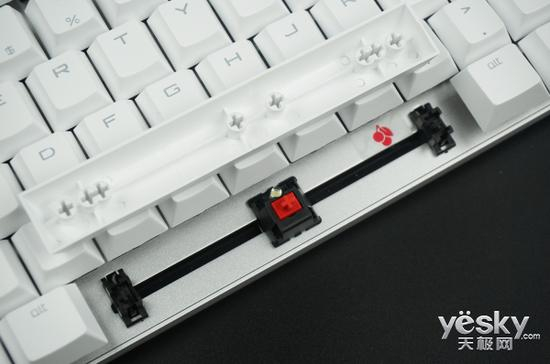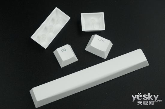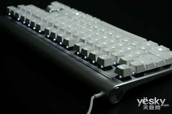 Cherry MX Board8.0在键帽工艺上采用的是ABS二色注塑工艺,同时也是首款量产版机械键盘采用这种完全封闭的背光键帽,此种工艺可彻底避免背光键帽上字母连接的断痕,例如“P”、“B”等字母上就不在会有强制断裂出现。