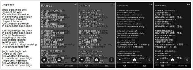 我们找了《jingle bell》这首圣诞歌曲的歌词来让翻译器完成“阅读理解”,分别英译中、英译日、然后再让翻译器把自己翻译的日文重新翻译成英语和汉语。