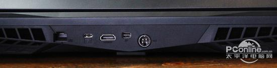 外界扩展能力方面,机身左侧除了一个安全锁孔外,还设置有一组音频接口,其中一个专为HI-FI耳机设计,这也看得出它是一款为游戏玩家打造的产品,但是除此之外机身左侧就没有设置任何USB接口。在机身右侧我们可以看到有1个SD读卡器以及3个USB3.0接口,在机身后方我们还可以看到有RJ45、Type-C、HDMI、DP、电源以及Type-C接口。