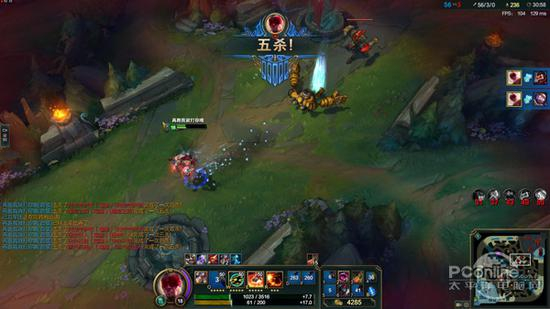 很多玩或者不玩英雄联盟的人对于它在硬件部分的评价往往都是:这游戏不吃配置,其实这个说法并不严谨。要知道,30帧的游戏画面也可以成为能玩,但是与100帧以上的实际游戏体验根本不在同一个级别上,特别是团战的时候,很容易出现掉帧。从测试结果来看,联想拯救者R720的帧数稳定在120帧以上,即使团战情况下,依旧可以带来流畅的游戏画面。