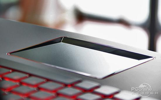我们在考察游戏本的时候,触控板这部分往往并不会但拿出来做介绍,毕竟没有人会用触控板去操控游戏。不过特别的是,此次联想拯救者R720对触控板这部分进行了精心设计。可以看到,它的周身采用了与键盘区一样的红色腰线,相当醒目。另外与我们常见的触控板不同,它略带凹陷,实际操控体验更加准确。