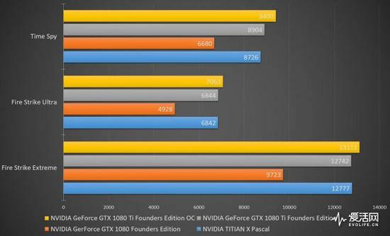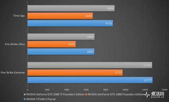 按照惯例依然先祭出3DMark Professional Edition的Fire Strike Ultra、Fire Strike Extreme以及针对DX12的Time Spy对三块显卡分别机型测试。可以发现GTX 1080 Ti相对GTX 1080提升在31%至38%之间,而TITAN X与GTX 1080 Ti表现相差不多,甚至在Time Spy中有大约200分的优势。
