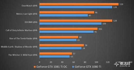 随后我们继续用超频后的GTX 1080 Ti继续对比,比较令人意外的是在DOOM4、Call of Duty:Infinite Warfare这样的游戏中性能提升更为明显,废话不说,继续放上数据: