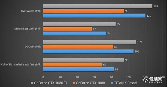 第一人称射击游戏包括Call of Duty:Infinite Warfare、DOOM4、Metro: Last Light以及时下热门的OverWatch,所有游戏画质均设置为4K分辨率最高画质。GTX 1080 Ti对阵GTX 1080的表现与之前TITAN X Pascal对阵GTX 1080的情形几乎一摸一样,实际表现提升在30%左右。