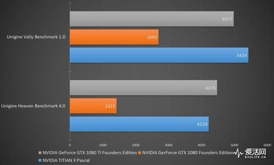 基于DX11测试中,TITAN X在Unigine Valley Benchmark 1.0扳回了一局,但Unigine Heaven Benchmark 4.0中又再次被GTX 1080 Ti超过。而相对于GTX 1080,GTX 1080 Ti的优势提升得非常明显,分别提升84%和210%。